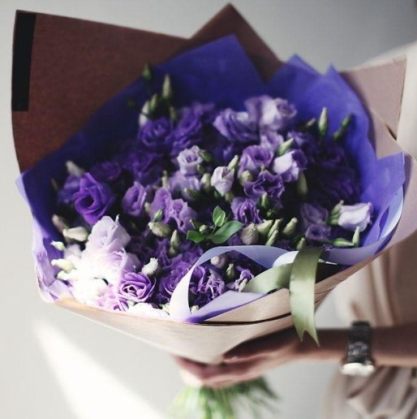 Сиреневые и фиолетовые лизиантусы в стильной упаковке