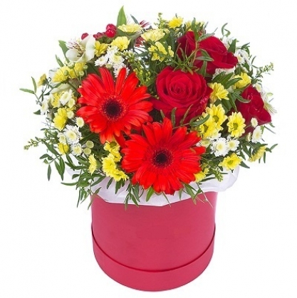 Яркая коробочка из роз, гербер, сантини и альстомерий с добавлением зелени фисташки и солидаго